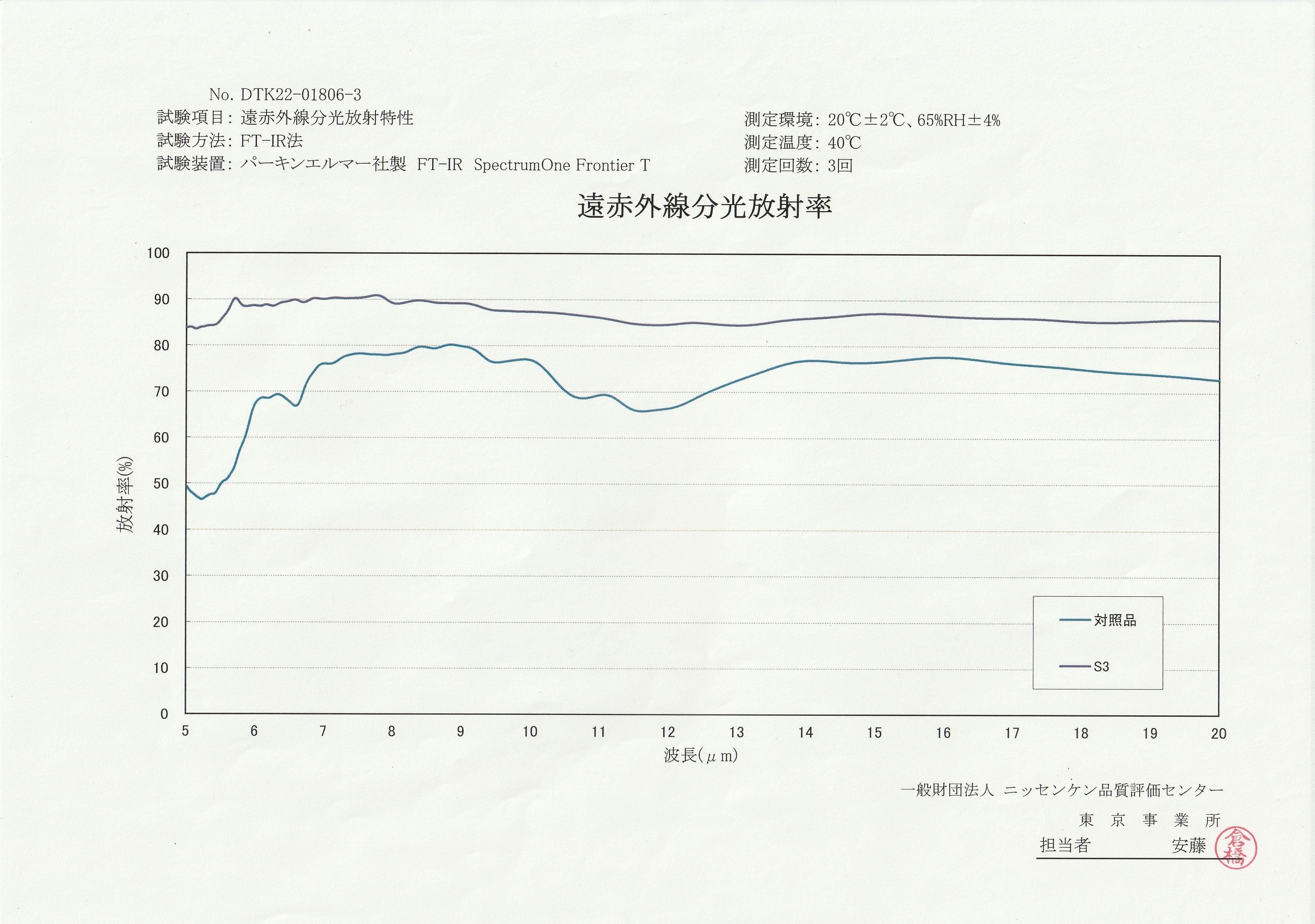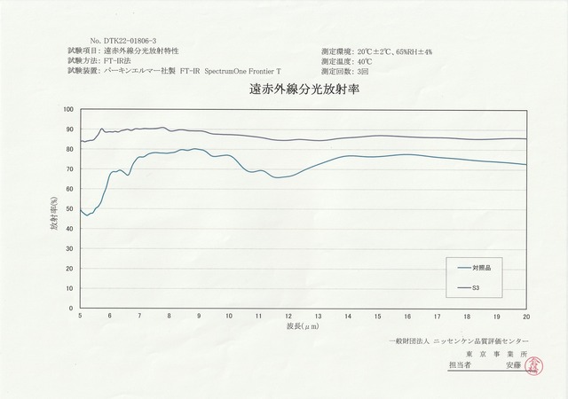 赤外線放射率のデータは「熱源の温度」と「周波数帯」が示されていたら完璧です。時々、熱源の温度が80℃といったデータを見かけますが、衣類にとっての熱源は体温ですから40℃程度で測定しないと意味がありません。また、人体に影響がない周波数帯のデータがあっても無意味です。一般医療機器の基準では5~20㎛の範囲とされているので、それが明示されていたらホンモノと見て間違いないでしょう。もちろんSPAOREはその条件で測定して、グラフも公開しています。